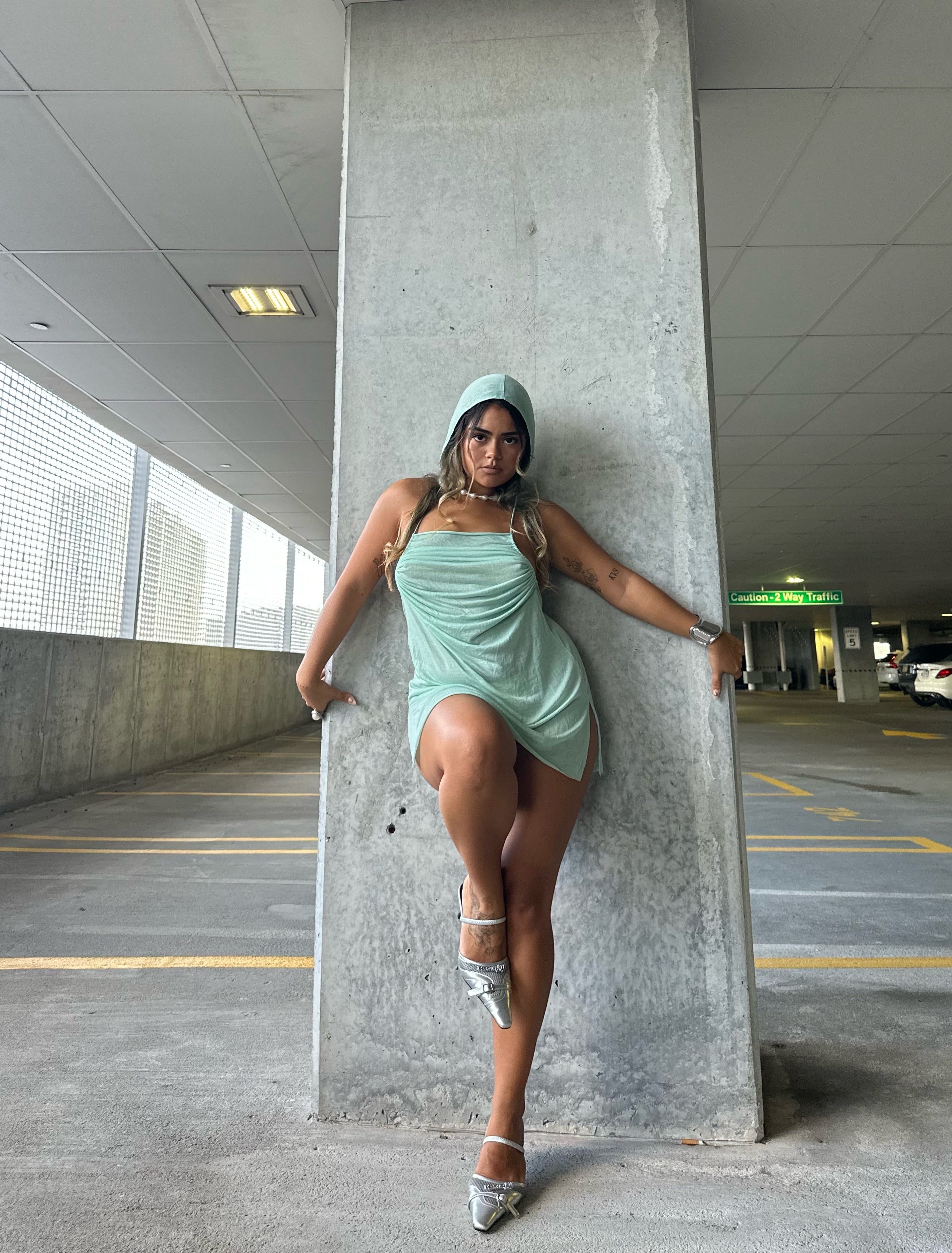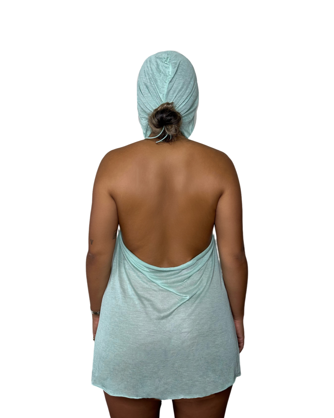 Our Calipso Mini Dress is made of silk sheer jersey featuring an adjustable cowl neck with an attached adjustable hood. Hood can be removed. Raw edge hem. Model is wearing a size Large for an oversized fit. We recommend sizing up. This is a MINI dress. Please 1-2 weeks for items to be made and shipped out.