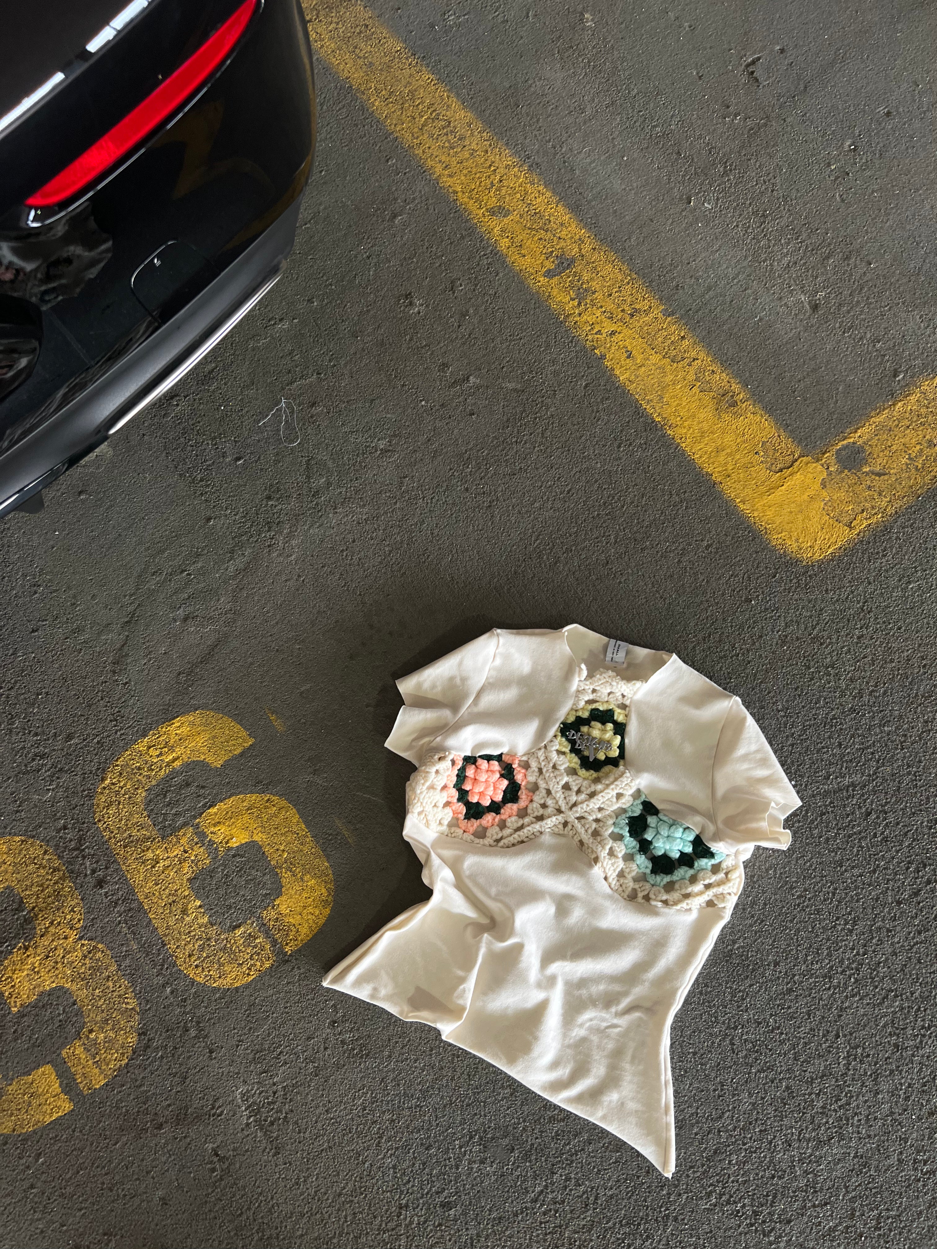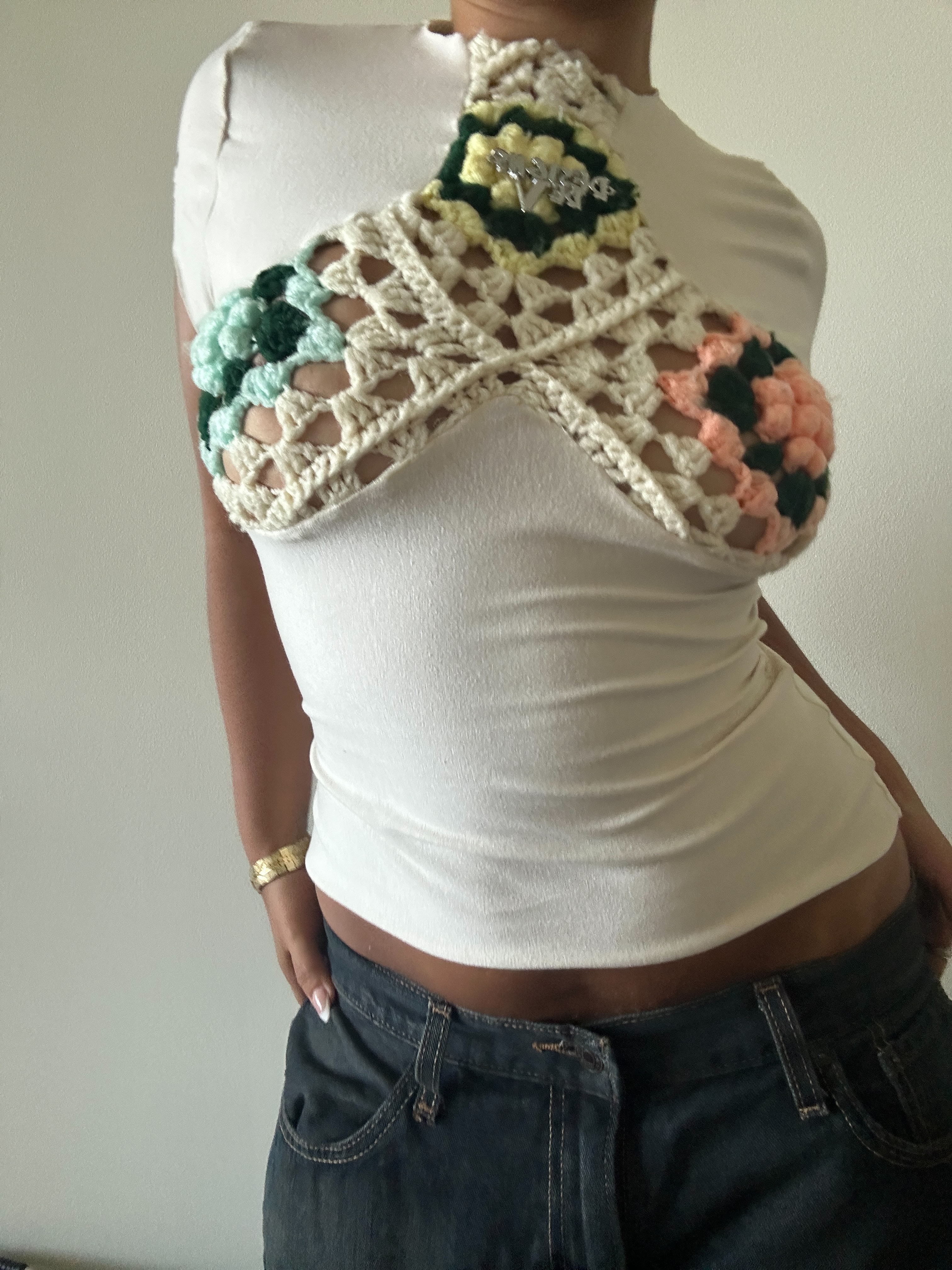 Our Coraza top is a reconstructed tee using repurposed material from crochet blankets. Featuring a handsewn DDV nameplate. Made out of 200 GSM cotton spandex that stretches vertical and horizontal. Color of flowers will vary. Fits true to size, model wears a size Small.