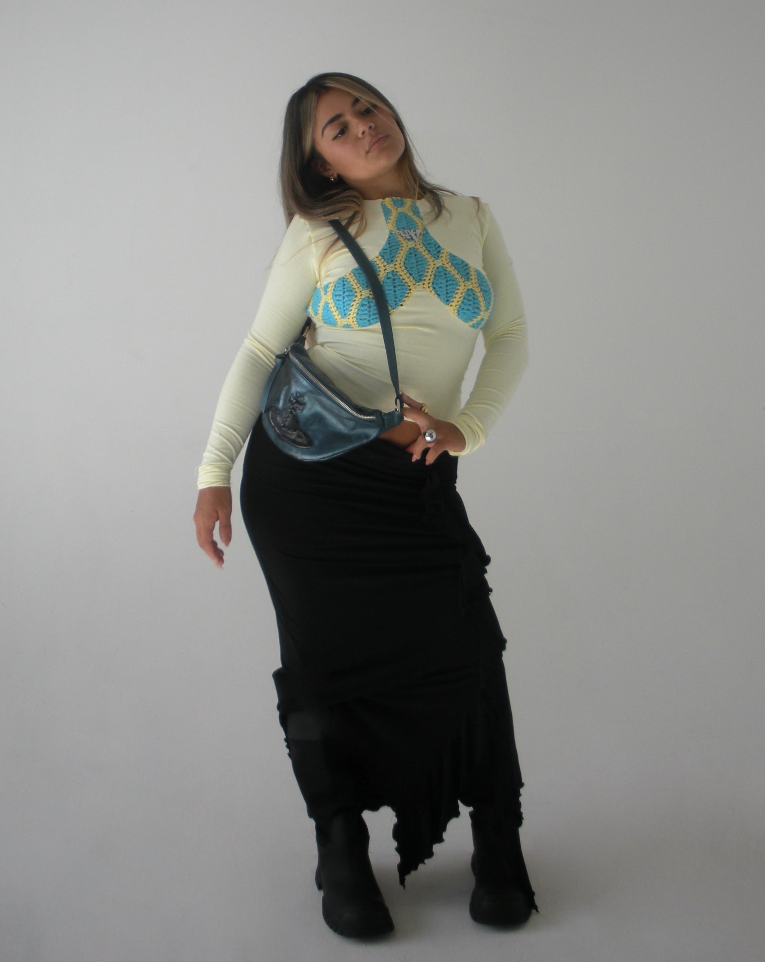 Reconstructed tee using repurposed material from knit blankets/scarves. Featuring a handsewn DDV nameplate. Made out of 200 GSM cotton spandex that stretches vertical and horizontal. Fits true to size, model wears a size Small.