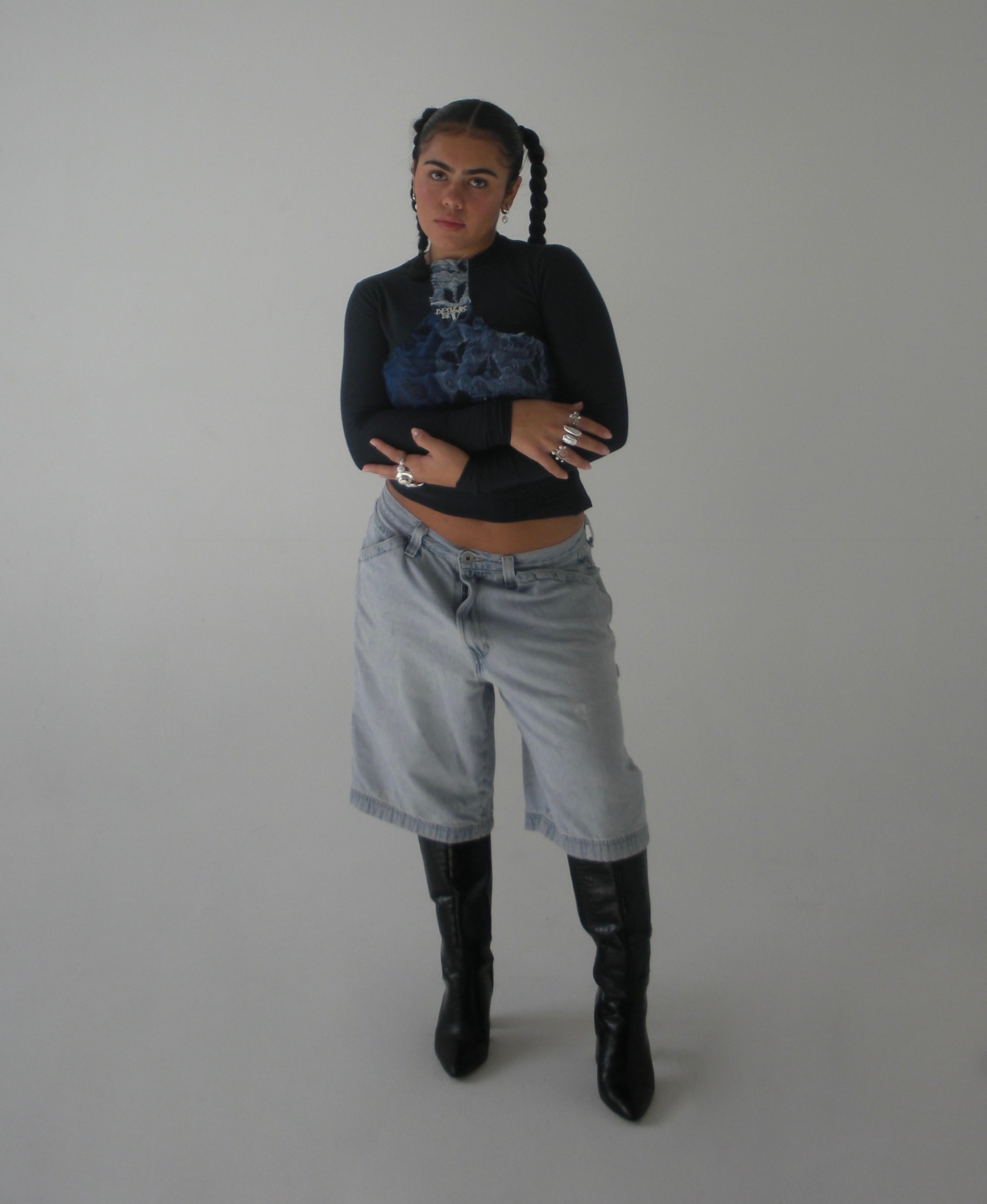 Reconstructed tee using repurposed material from knit blankets/scarves. Featuring a handsewn DDV nameplate. Made out of 200 GSM cotton spandex that stretches vertical and horizontal. Fits true to size, model wears a size Small.