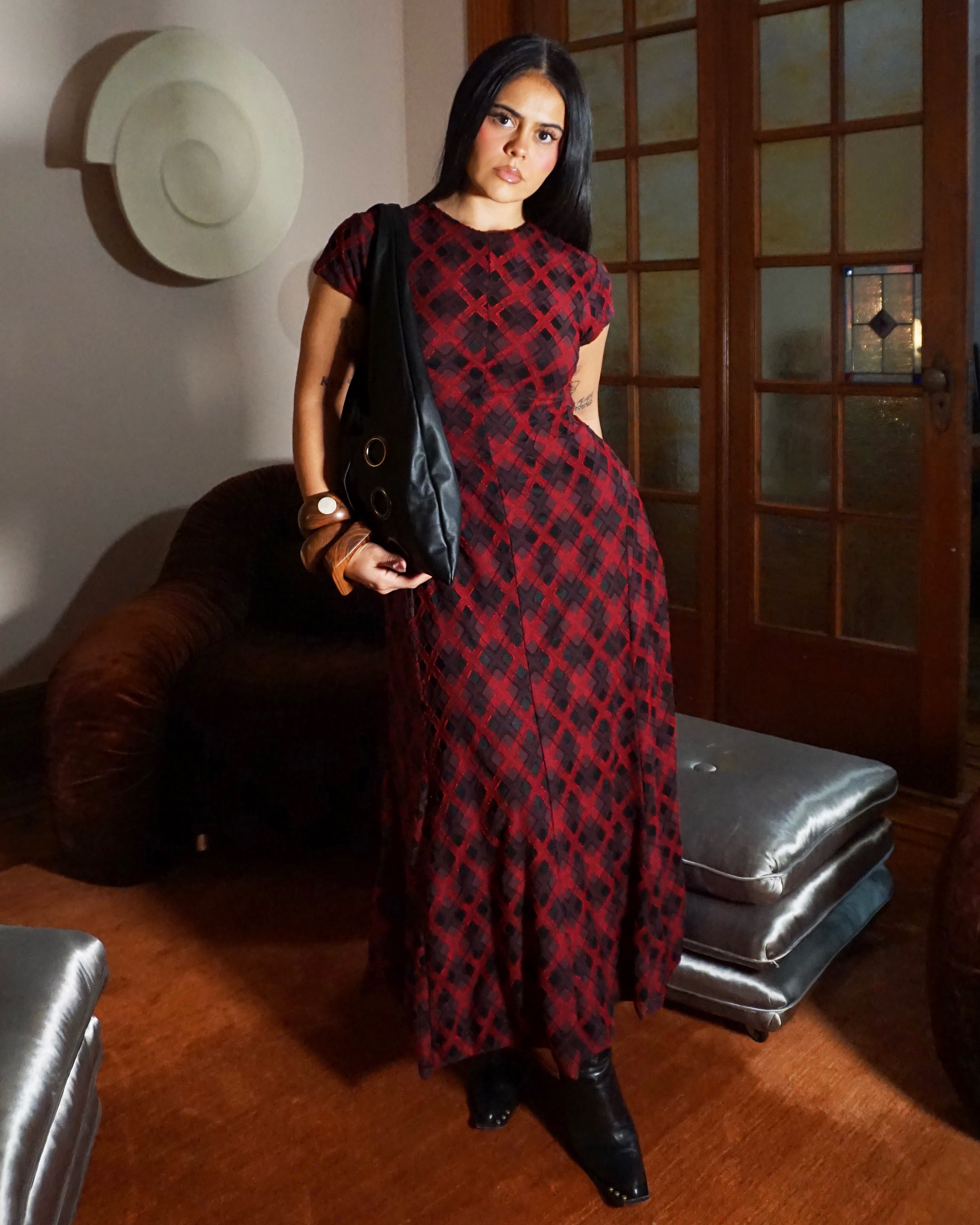 A soft, sculpted take on the classic T-shirt dress. Constructed with 6 flared panels it creates a gentle petal-like movement that gives the dress volume and flow from the hip down. Made out of jacquard knit that drapes effortlessly, hugging the body through the torso and blooming at the hem, creating a subtle hourglass shape. Model wears a size M, has a lot of stretch.